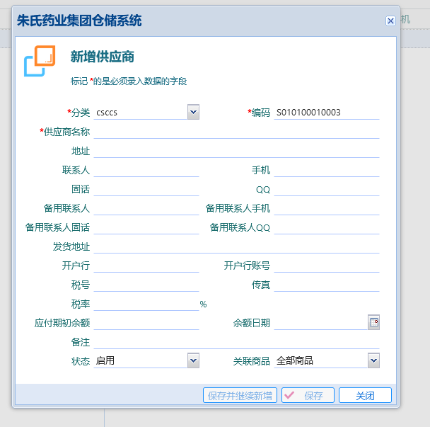 【新增供应商】选择供应商分类,供应商编码(可自动生产,也可手动修改,但是不能重复),供应商名称(不能重复);