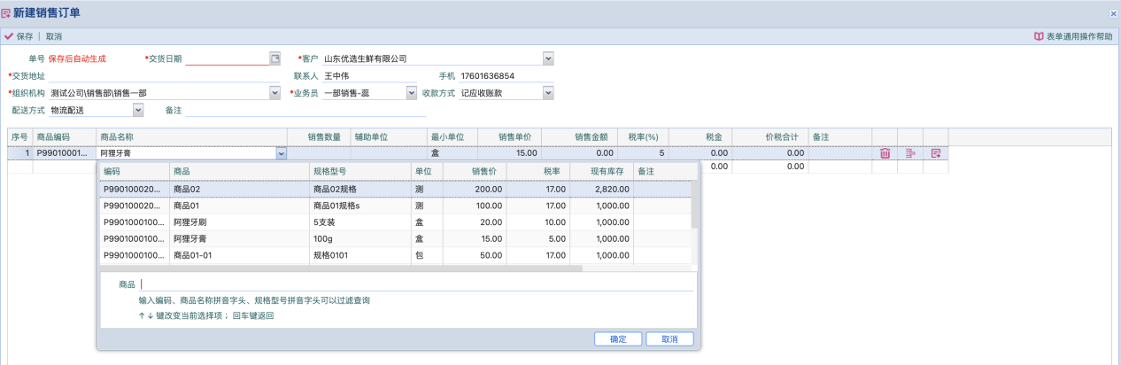 下拉框显示商品列表,在“商品”输入框,可输入关键字(包括商品编码、商品名称首字母、规格型号)查询商品;