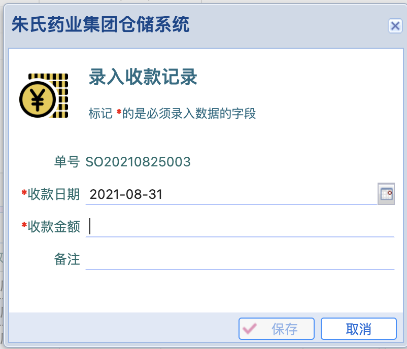 l 点击“业务单据”中的销售订单,可在右侧“收款记录”,查询当前销售订单的收款记录,点击按钮【录入收款记录】,可录入我方收款记录“收款时间(可手动选择)”“收款金额”,均必填;