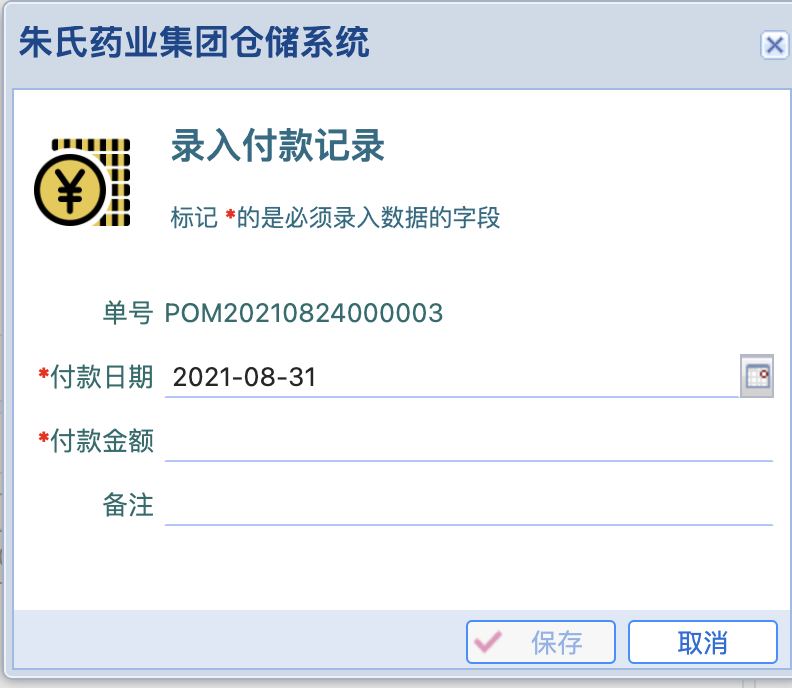 l 点击某个采购订单,在右侧可查看当前采购订单的付款记录,点击按钮【录入付款记录】,可输入付款记录:付款时间(手动选择)、付款金额,均必填;