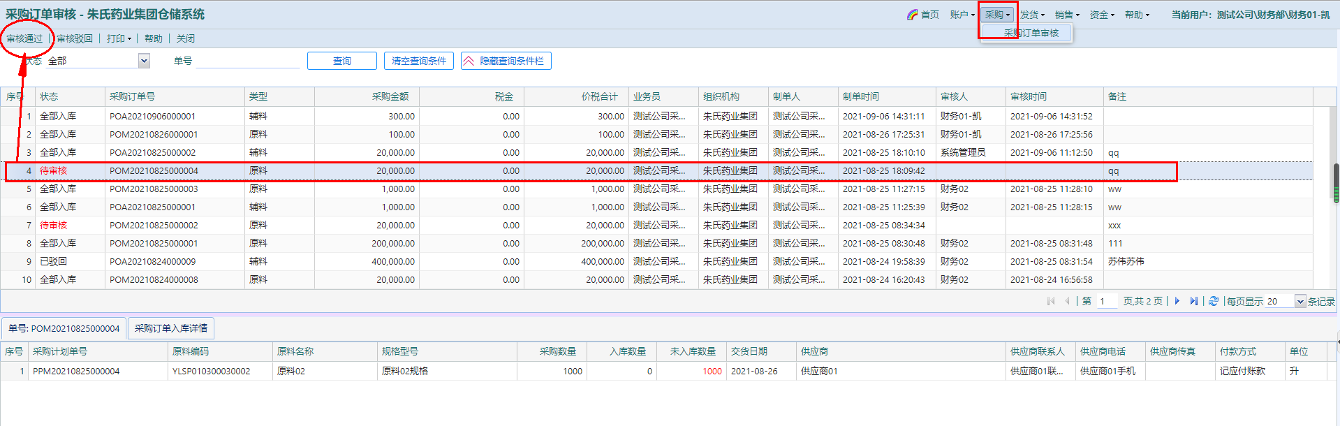 l 点击选中当前采购订单,点击按钮【审核通过】或【审核驳回】审批,