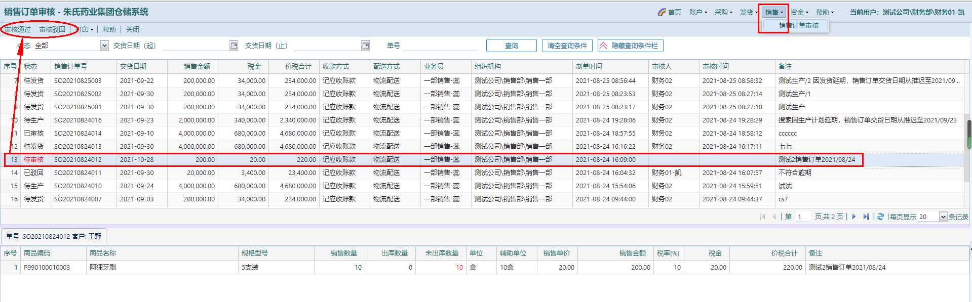 l 点击选中要审核的销售订单,点击按钮【审核通过】或【审核驳回】审批,