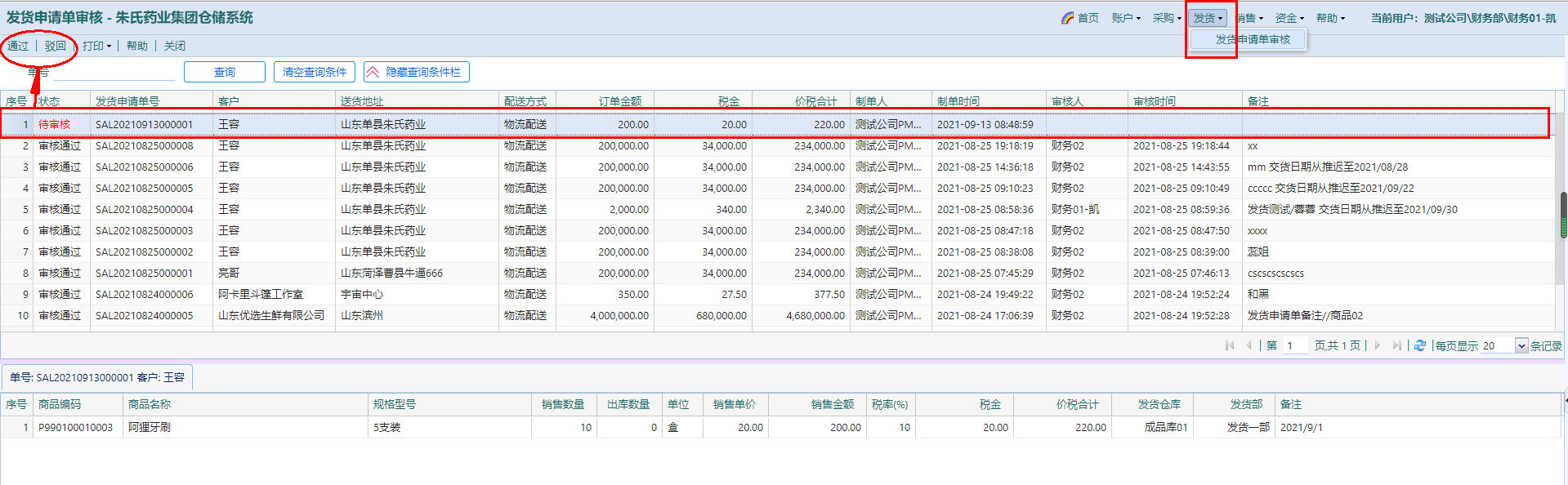 l 点击选中当前发货申请单,点击按钮【通过】或【驳回】进行审批,