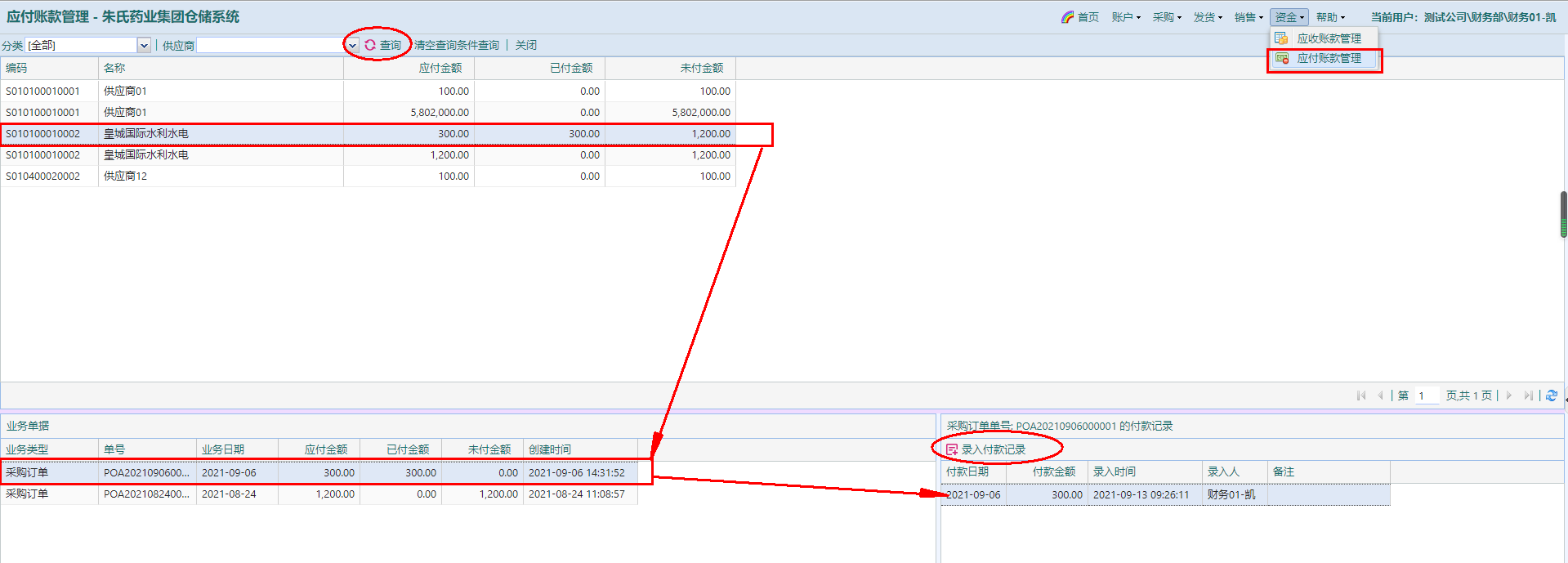 选择其款项明细,即可录入付款记录