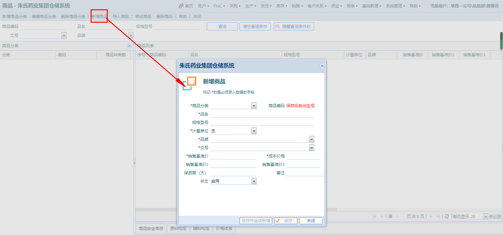 点击按钮“新增商品”,弹窗输入商品信息,带星号*的为必填项,若留空,无法添加商品;