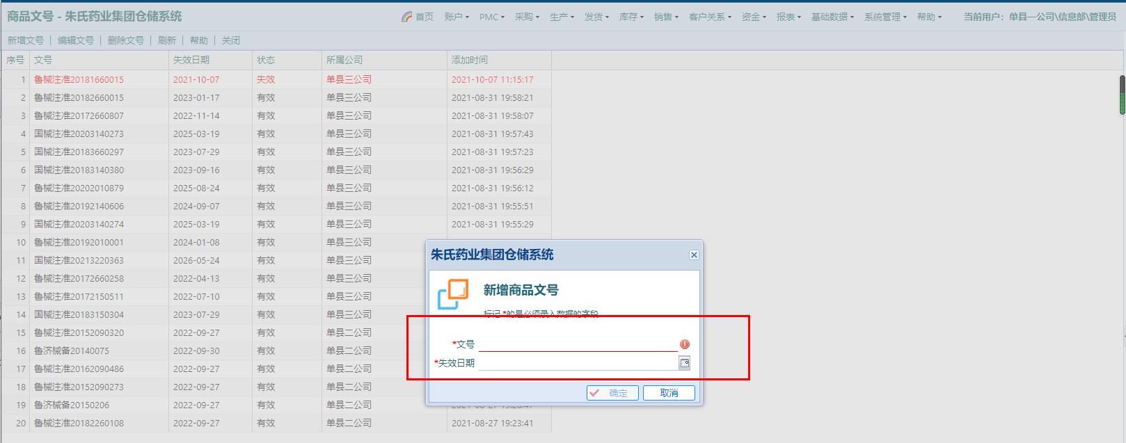 【新增、编辑文号】:“文号”,必填;“失效日期”,必填;