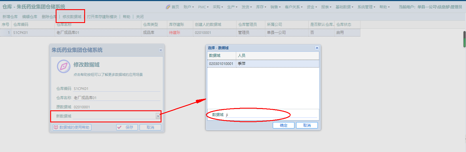 点击选中仓库,点击按钮“修改数据域”,在弹窗“新数据域”下拉框显示用户,新的弹窗选中用户或者在“数据域”输入登录名或者姓名的拼音进行搜索;选中用户,确定,保存即可。