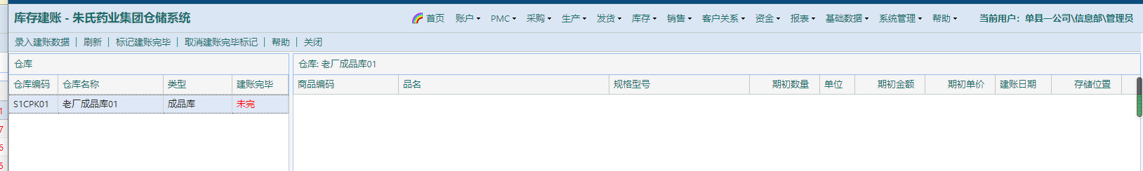 在当前页面选中也建账的仓库,点击“录入建账数据”,详情见7.2库存——库存建账
