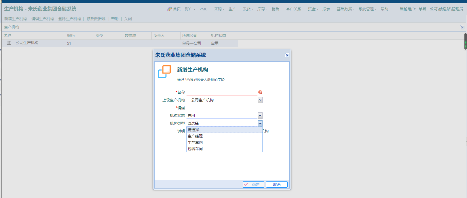 机构类型分为“生产经理”和“生产车间”,全部机构都是“一公司生产机构”的子机构;