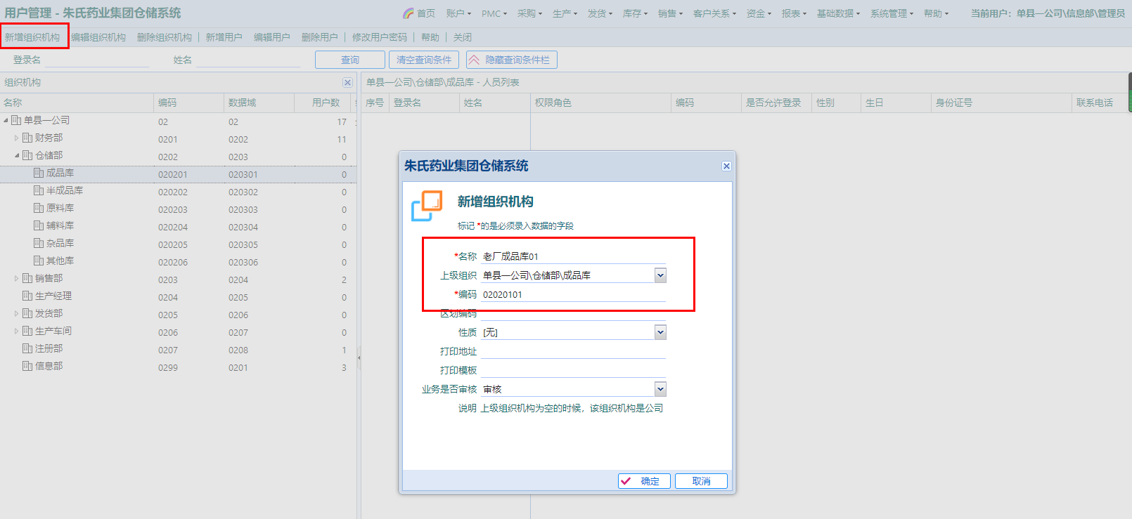 “所属组织”,为某个机构在添加人员时,可先点击选中当前组织机构,让后点击“新增用户”,可自动选中;