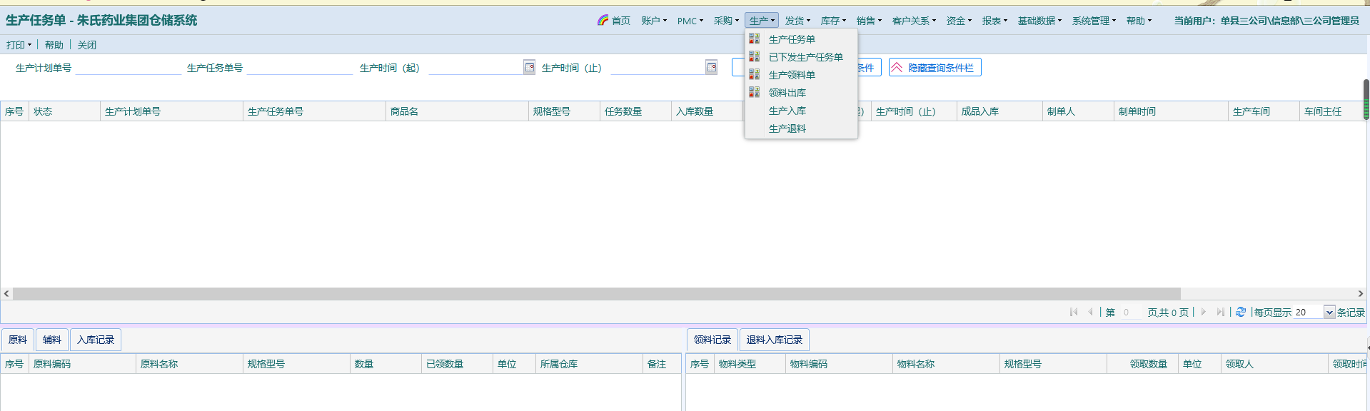 查看“生产任务单”“已下发生产任务单”“生产领料单”“生产入库”“生产退料”