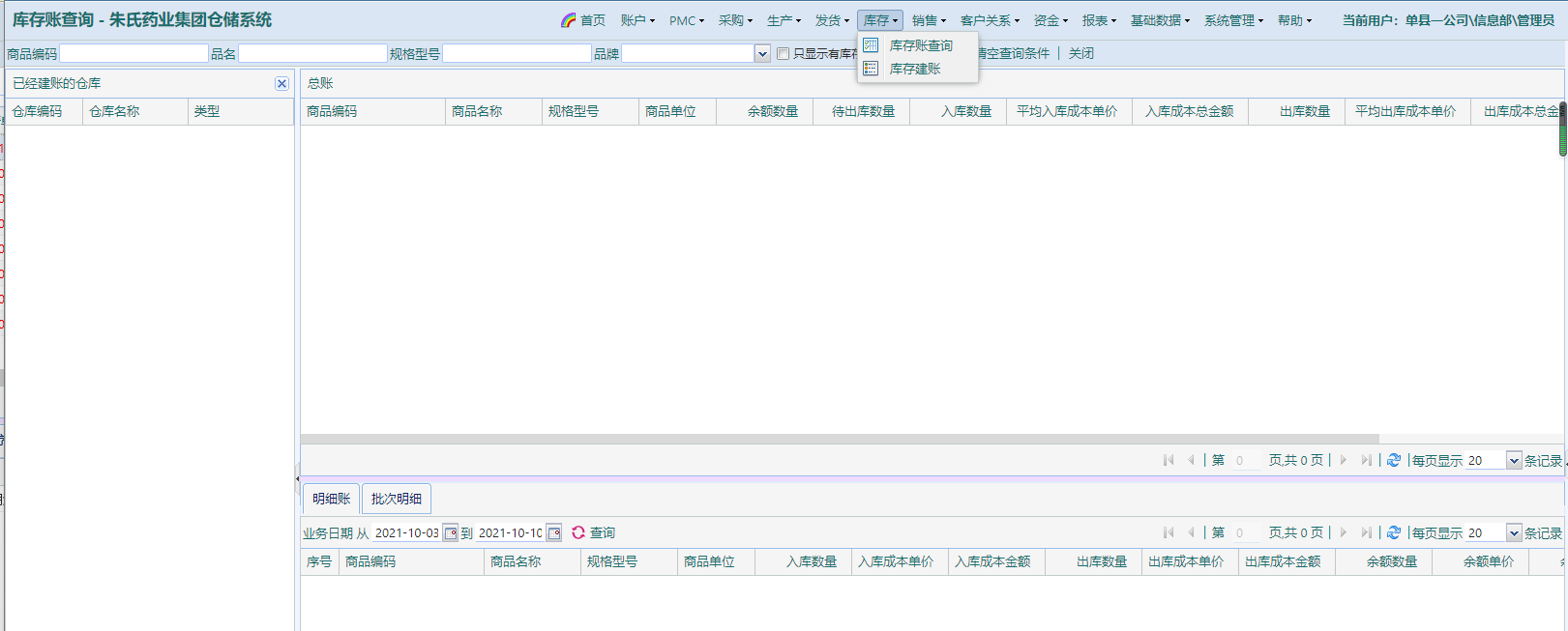 查询仓库(已建账完毕的)物料信息,库存信息,出入库记录等;