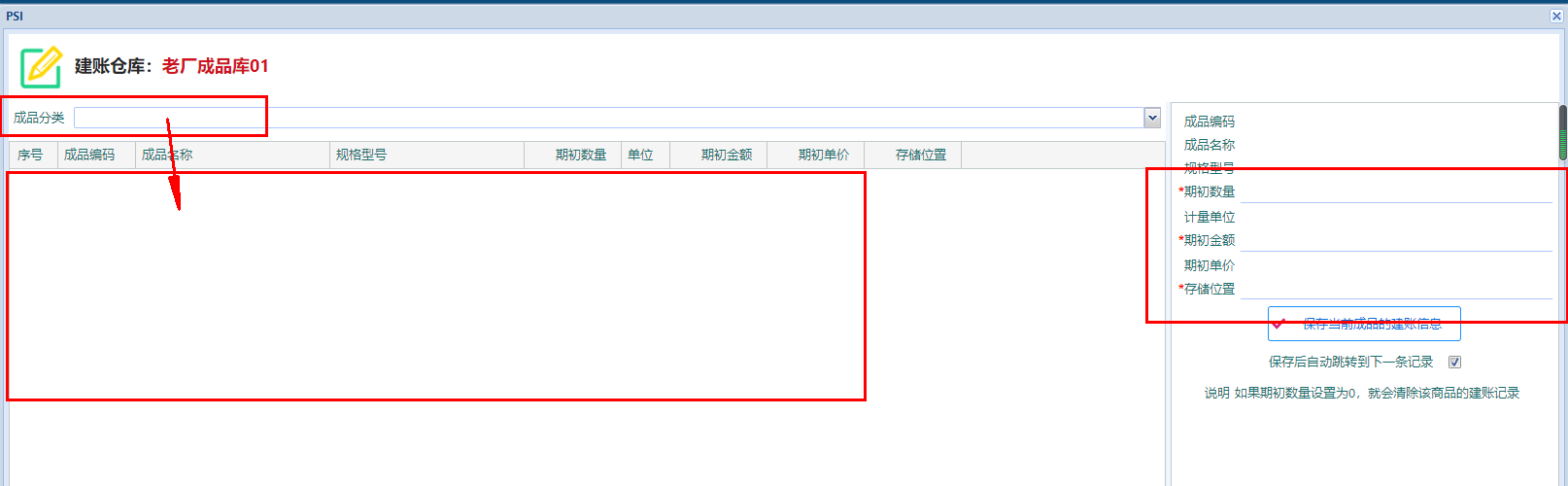 点击按钮“保存当前成品的建账信息”,将输入的数据保存到系统;